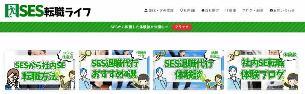 SES転職ライフは、SES(客先常駐)で働くエンジニア向けの転職情報サイトです。SESから社内SEや自社開発、ITコンサルなどへのキャリアチェンジ方法を体験談や実践的ノウハウで解説。転職サイトの活用法や転職ロードマップ、退職・副業など多角的なテーマの記事を掲載し、SES脱出を目指す人の具体的な行動をサポートします。
